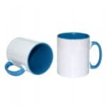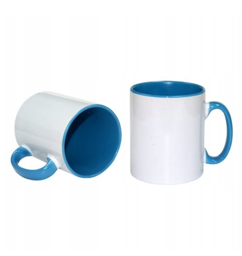 Biała, zewnętrzna powierzchnia jest pokryta specjalną powłoką poliestrową, gwarantującą idealne odwzorowanie kolorów i długotrwałą odporność na mycie (zalecamy mycie ręczne dla utrzymania najwyższej jakości). Niebieskie wnętrze oraz duże, wygodne ucho w tym samym kolorze tworzą atrakcyjny kontrast dla białej grafiki i doskonale komponują się z logo firmowym, zdjęciem lub dowolnym projektem.